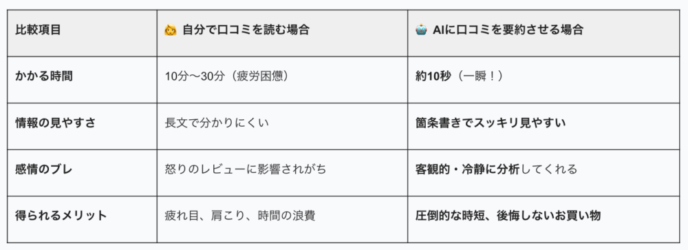 AIに任せる最大のメリットは、「感情に振り回されず、客観的な事実だけを抜き出してくれる」こと。これが、賢いお買い物には本当に重要なんです。