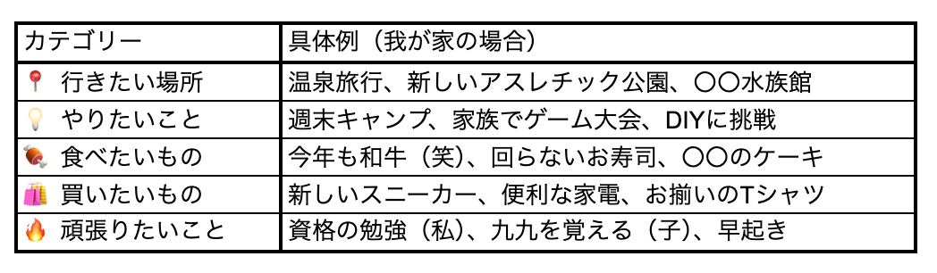 AIのおかげで親の思考がスッキリしたところで、いよいよ家族での目標出しです。 今年は漠然と書くのではなく、具体的なカテゴリーに分けて書き出しました。